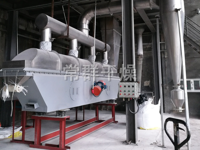 物料自進(jìn)料進(jìn)口進(jìn)入機(jī)內(nèi),在振動(dòng)力作用下,物料沿水平面流化床拋擲,向前連續(xù)運(yùn)動(dòng),熱風(fēng)向上穿過流化床同濕物料換熱后,濕空氣經(jīng)旋風(fēng)分離器除塵后由排風(fēng)1:3排出,干燥物料由排料進(jìn)口排出。