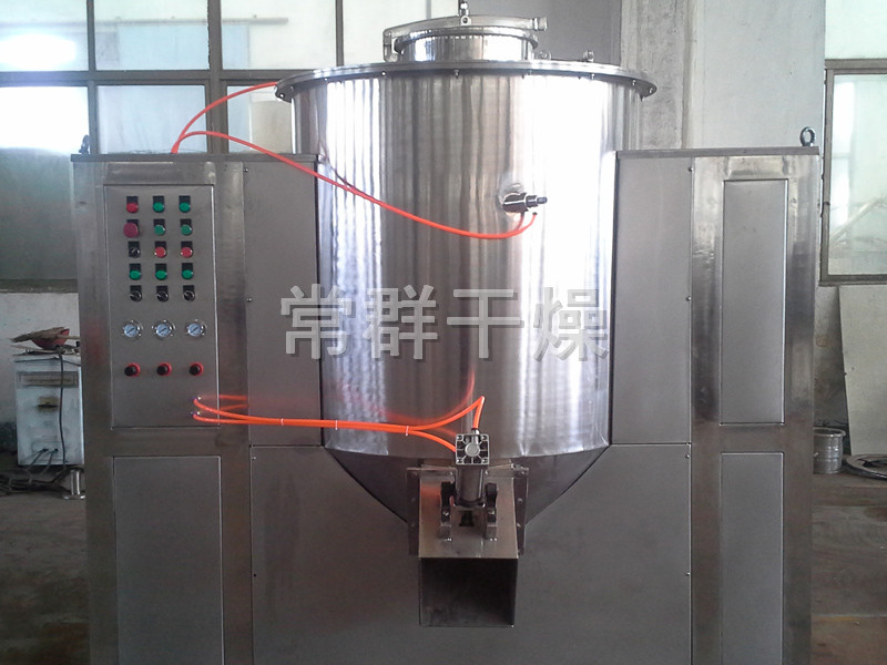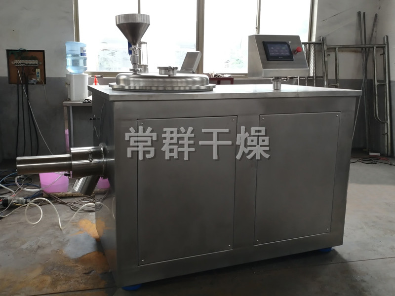 粉體物料與粘合劑在圓筒形容器中由底部混合漿充分混合成濕潤軟材,然后由側置的高速粉碎槳切割成均勻的濕顆粒。