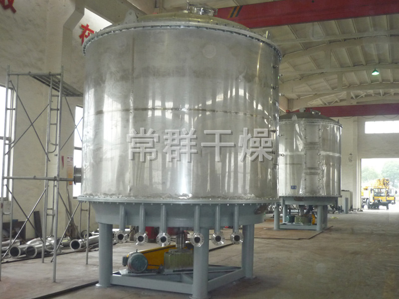 濕物料自加料器連續(xù)地加到干燥器上部第一層干燥盤上,帶有耙葉的耙臂作回轉(zhuǎn)運動使耙臂作回轉(zhuǎn)運動使耙葉連續(xù)地翻抄物料。物料沿指數(shù)螺旋線流過干燥盤表面,在小干燥盤上的物料被移送到外緣,并在外緣落到下方的大干燥盤外緣,在大干盤上物料向里移動并從中間落料口落如下一層小干燥盤中。大小干燥盤上下交替排列,物料得以連續(xù)地流過整個干燥器。中空的干燥盤內(nèi)通入加熱介質(zhì),加熱介質(zhì)形式有飽和蒸汽、熱水和導(dǎo)熱油,加熱介質(zhì)由干燥盤的一端進(jìn)入,從另一端導(dǎo)出。已干物料從最后一層干燥盤落到殼體的底層,最后被耙葉移送到出料口排出。濕份從物料中逸出,由設(shè)在頂蓋上的排濕口排出,真空型盤式干燥器的濕氣由設(shè)在頂蓋上的真空泵口排出。從底層排出的干物料可直接包裝。通過配加翅片加熱器、溶劑回收冷凝器、袋式除塵器、干料返混機構(gòu)、引風(fēng)機等輔機,可提高其干燥的生產(chǎn)能力,干燥膏糊狀和熱敏性物 料,可方便地回收溶劑,并能進(jìn)行熱解和反應(yīng)操作。